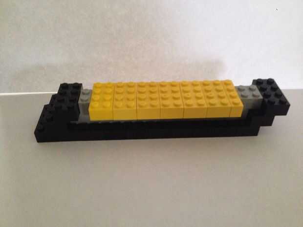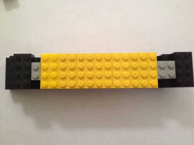 De izquierda a derecha: colocar uno negro 2 x 4 en la parte superior capa 2, encarte 1 fila. Además, colocar el gris 1 x 2 (centrado) en piezas gris capa de 2. Lugar 6 piezas de 2 x 4 amarillo side-by-side, seguido por el amarillo 1 x 4. Luego coloque el gris 2 x 2 (centrado). Poner fin a esta capa con el segundo negro 2 x 4 en el extremo de la derecho, para que sobresalga de la capa 2 por 1 fila.
