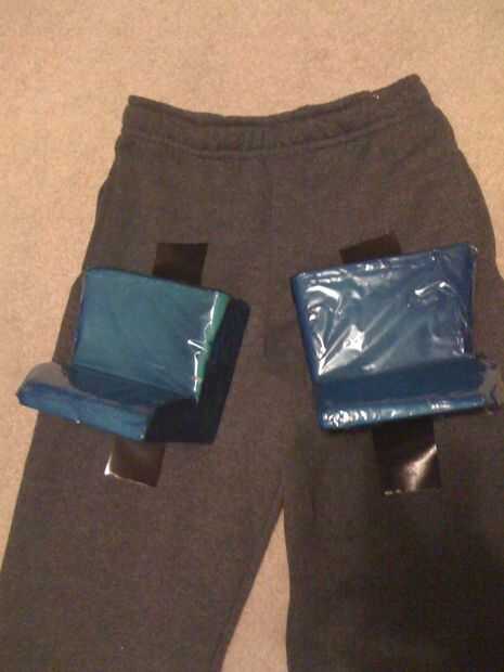 Construir unos trozos de espuma de poliestireno para que coincida con la forma de las piernas de monstruos de roca. Arena según sea necesario y envolver en material azul, asegurar con pegamento caliente. Fije a los pantalones de sudor con cinta negra por lo que se mueven libremente con las piernas del niño.