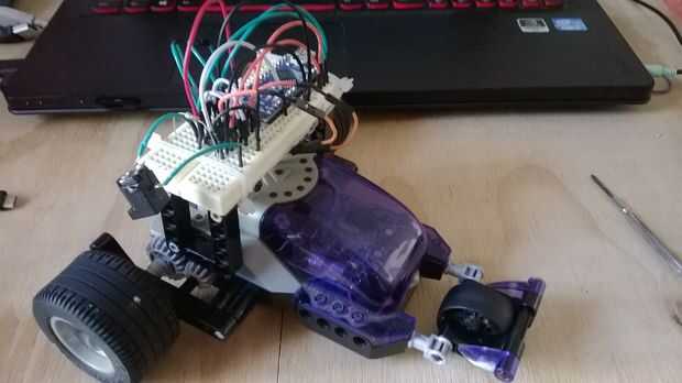 Conectar el Arduino como se indica en el paso anterior y en el código. 3 pilas AA funcionan bien para los motores (puede tomar prestada la bahía de batería existentes para alojarlos).