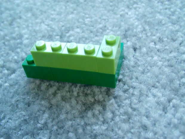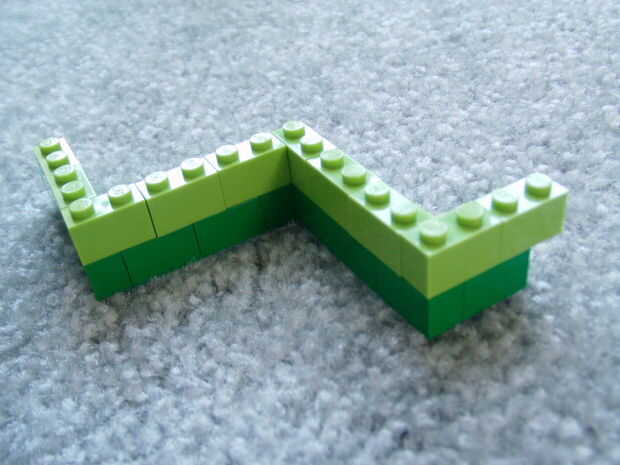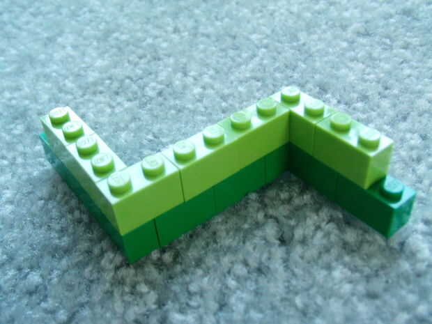 Empezar haciendo la forma de L como se muestra en la primera foto con sólo dos hileras de ladrillos. Hacer un zig-zag como muestran en los cuadros segundo y terceros, asegurándose de que cada lado es 7 clavos (los puntos en la parte superior) de largo.