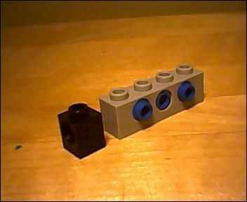 Poner la técnica / conectores de ladrillo en el 1 x 4 ladrillos como se muestra y llevar a cabo un ladrillo de 1 x 1 con un agujero.