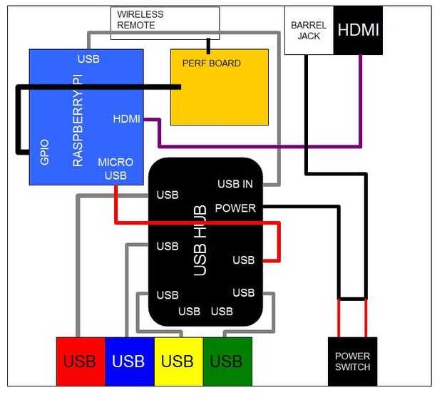 Aquí puedes ver mi enfoque: en el exterior, quería cuatro puertos USB de frente junto con el interruptor de encendido de fácil acceso, y luego el HDMI y el barril jack en la parte posterior de la caja (similar a lo que usted encontraría en una consola de juego regular, reproductor de DVD etc.). Interior, tengo el Raspberry Pi, hub USB, control remoto inalámbrico y un tablero perf (cambia de la versión sin soldadura, no quería cosas cayendo dentro de la caja).