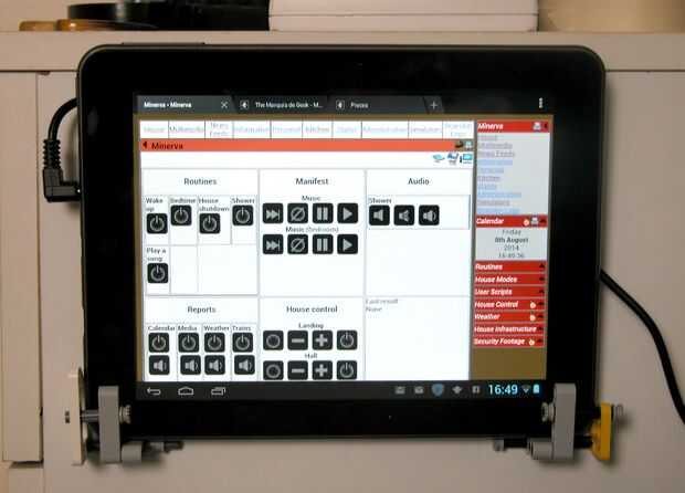 El software que estoy usando para el control de la casa se llama a Minerva (www.MinervaHome.net), y el papel tapiz es una imagen LCARS que encontré en línea. El reloj es un Android applet llamado reloj LCARS, o similar.