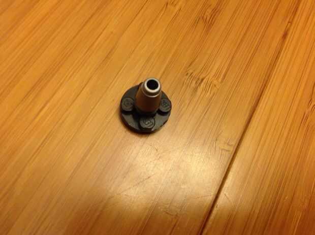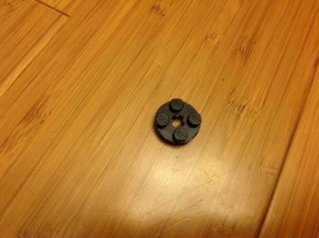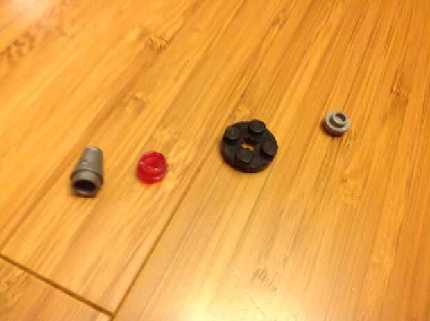 Take off the eye. Colocar un ladrillo de 2 x 2 círculo negro entonces añadir un poste gris en el centro. Agregar un cono gris en el perno. Luego añadir un poste rojo al cono.