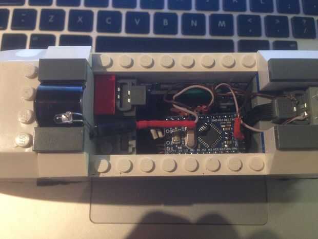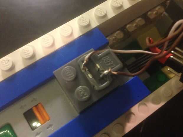 Como para la conexión a la batería de Lego, solo soldado a dos alambres que conducen al convertidor de voltaje y de allí por había enganchado todo hasta eso.