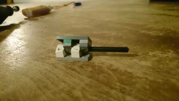 2. Tome las piezas de 2 x 1 con la Cruz como agujeros y pegarlos en los pieses fina de 2 x 1. Luego pegue los en la parte inferior de la pieza de 4 x 2 con todas las clavijas de corte.