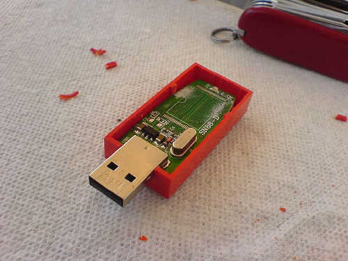 Se cortó una ranura en el caso para localizar el conector USB y después de una pequeña cantidad de modificación de la PCB se instaló el palo.