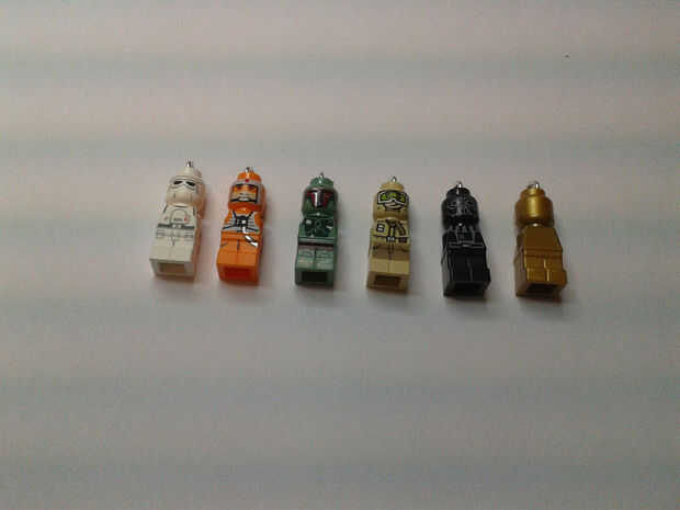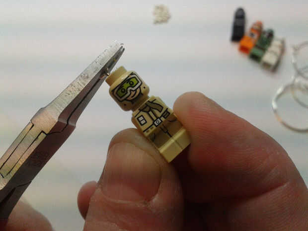 So... Supongo que esto podría ser sacrilige a algunos, pero usted tendrá que añadir fianzas a su Lego, así que usted puede colgarlos como encantos. Más Lego es lo suficientemente suave como para que las fianzas se atornille directamente usando sólo un par de pinzas; puede utilizar una broca fina de 1mm para perforar un agujero en primer lugar si usted prefiere, pero tener cuidado porque el taladro creará suficiente calor para derretir el Lego!