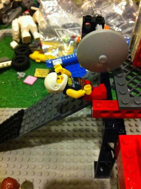 como todos los cursos de wipeout justo después de subir hasta una caja de escalera (o escalera) algo te golpeará para esto pongo un ladrillo levantado (con un agujero) pegado a un palo (con un disco adosada al extremo) a través del agujero y y poner un tapón en el extremo