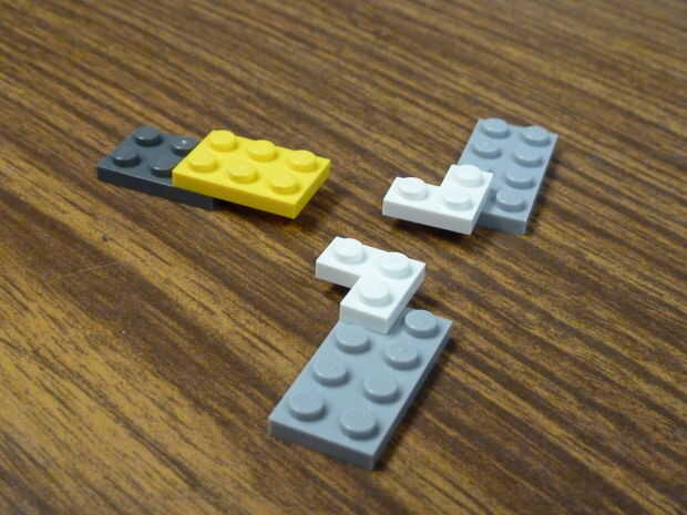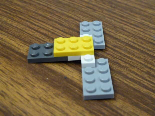 Tomar las piezas de esquina color blanco y adjuntarlos en la esquina a las placas de color gris claro 2 x 4 como se muestra en la figura superior anterior. A continuación tomar el gris 2 x 3 y poner la primera fila de un amarillo placas de 2 x 3 en la última fila de la placa gris. (como se muestra en la figura superior arriba). Traer las piezas de esquina, juntos se conectan a la parte inferior de la placa de 2 x 3 amarillo (ver figura anterior), el ala delantera se une al cuerpo principal justo en frente del ladrillo de 1 x 2 azul (utilice la muesca como guía).