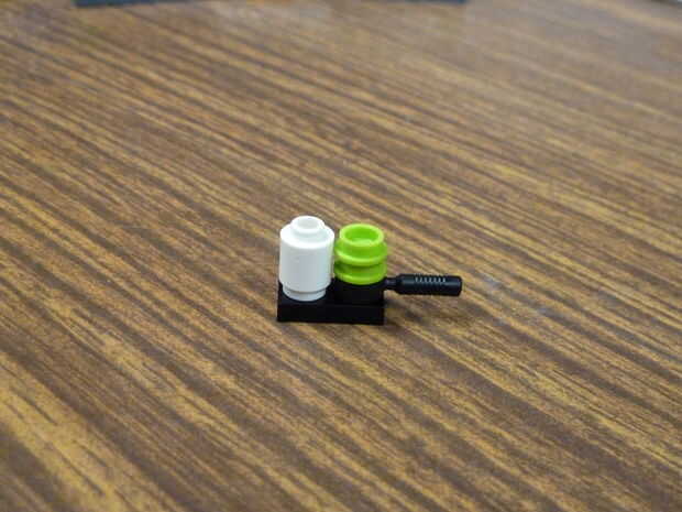 Coloque el cilindro blanco 1 x 1 en la primera clavija de la placa negra de 1 x 2. Ate el pedazo de llave en la clavija restantes de la placa de 1 x 2.  Apilar los dos botones verdes finales encima de la otra.  Voltear la pila e inserte la llave. El conjunto de todo el motor se conecta a la cola mediante la clavija hueco del cilindro blanco conectado a la clavija interior del ladrillo de 1 x 3 de la cola (visible en la parte inferior del ladrillo de 1 x 3).