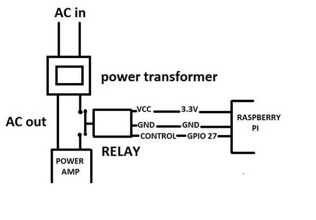 Para evitar el ruido de baja frecuencia en el cierre del Raspberry Pi, he utilizado un relé entre el transformador de AC y el amplificador de potencia. Lo he utilizado con conexión normalmente abierta entonces, si paradas de Raspberry Pi, amplificador no tiene ningún poder. Cuando empieza a Raspberry Pi, con una secuencia de comandos conducir energía al relé que cierre la conexión del circuito del amplificador.