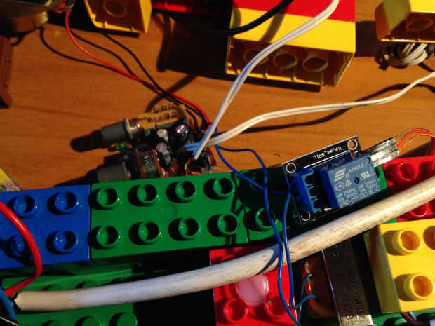 Corriente alterna entra LEGOLED con dos cables diferentes. Lo hice porque con un solo cable hubo alguna interferencia entre la pantalla led y amplificador de audio. Primer cable de AC pasa directamente al transformador de potencia de amplificador y va segundo en los demás.