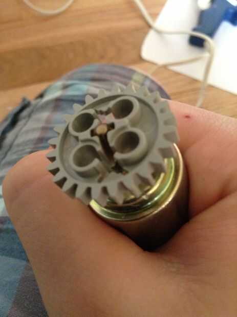 Poner un poco de pegamento caliente en la punta del motor entonces Deslice el equipo y asegúrese de que es estrecho no inclinada