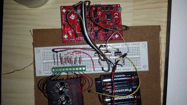 En la primera prueba hemos utilizado solamente 2 de 3 leds para bajar los cables de alimentación de corriente 6v (baterías 4xAA)