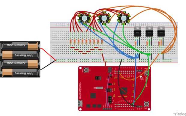 El circuito es muy simple, con la cc3200 que tenemos para el control de 3 canales (rojos, verdes y azules) para cada uno led al mismo tiempo, así que vamos a usar 3 pines pwm de la Junta de TI: