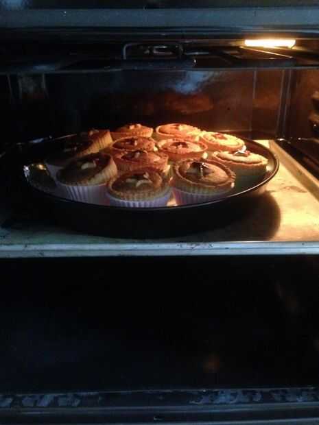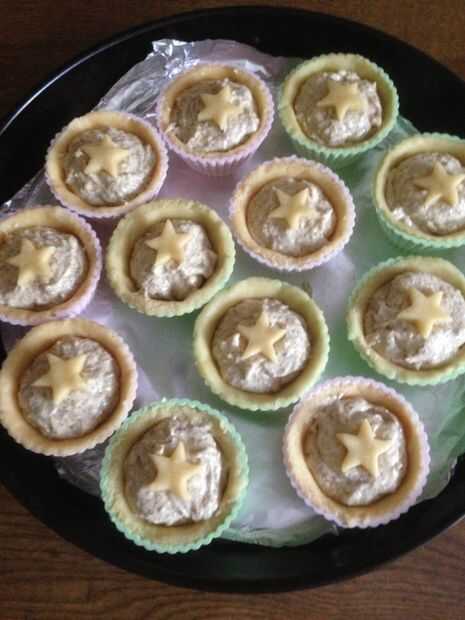 Llene cada molde con el relleno y decorar colocando una estrella encima de cada taza. Bata la yema de huevo y leche y capa de las estrellas con él. Hornear durante unos 25 minutos.
