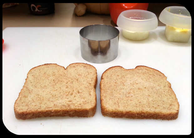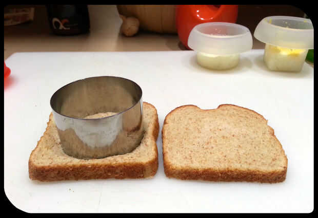 Utilizando el formulario de alimentos redondo, cortar piezas circulares en el centro del pan o tostada si quieres.