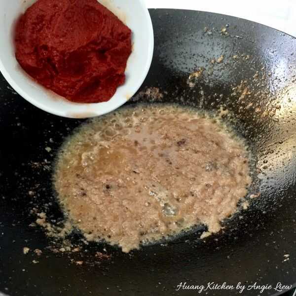 Luego agregar la pasta de Chile y continuar para freír durante unos 15 minutos hasta que se separe el aceite.