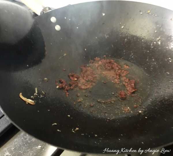 Añadir la pasta de camarón y freír hasta que se libere su sabor.