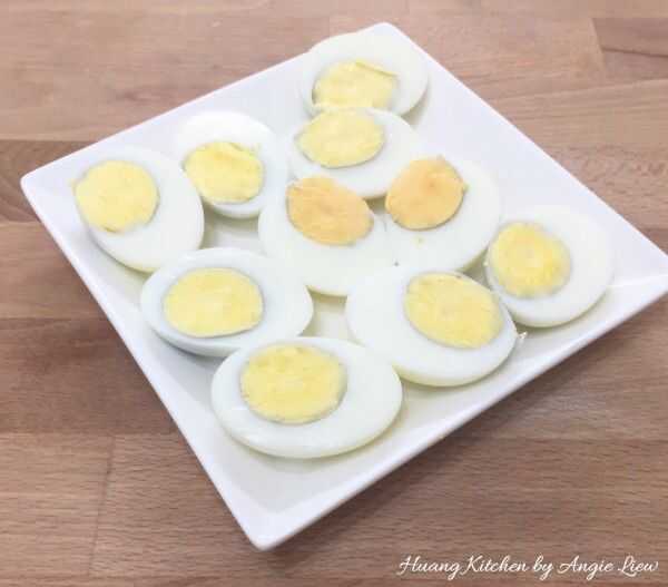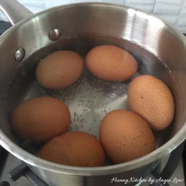 Primero, vierta agua en una olla. Añadir los huevos. A continuación, encienda la llama. En el punto de ebullición, cubrir la olla y apagar la llama y dejar cocinar durante 15 minutos. Para mantener la yema en el centro para la mejor presentación, remover la olla de vez en cuando cuando se está cocinando el huevo. Quitar las cáscaras de huevo cuando estén todavía calientes. Usando un cuchillo afilado, cortar los huevos por la mitad cuando hayan enfriado para asegurarse de que las yemas son rebanadas suavemente. Luego ponga a un lado para servir con el arroz de leche de coco caliente.