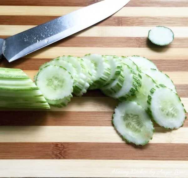 Utilice la variedad local. Cortar ambos extremos y pelar el pepino. Luego corte en rodajas gruesas. No hay necesidad para quitar las semillas. Reservar para servir con el arroz de leche de coco.