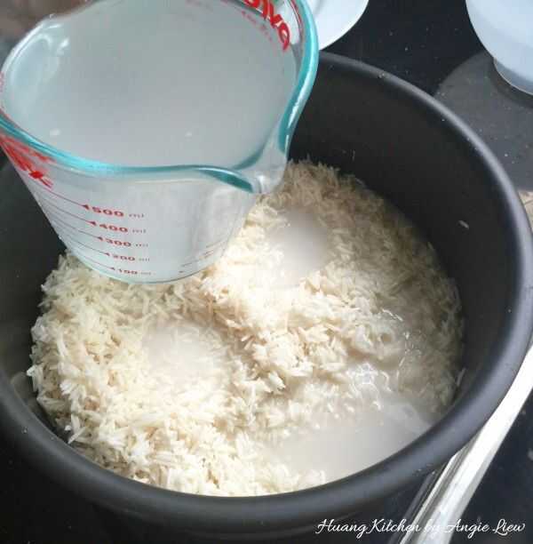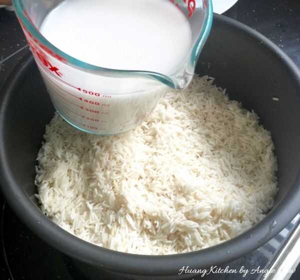 Agregar agua adicional para asegurarse de que el volumen de la leche de coco acuosa es el mismo que el arroz en volumen. (En conjunto aproximadamente 6 tazas).