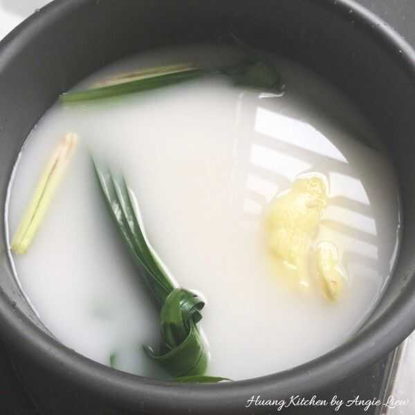 Por último añadir en hojas machacadas de jengibre, hierba limón y pino del tornillo. Las hojas machacadas de jengibre, hierba limón y pino del tornillo imparten sabor y hacen el leche de coco cocido arroz increíblemente aromático.