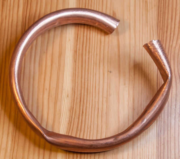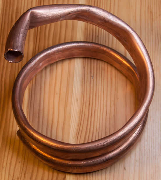 Ahora se puede doblar la tubería en una bobina. Encontré un trozo de tubo de 4 pulgadas para envolver el tubo alrededor. Hubo algunas secciones donde la arena no había llenado completamente el tubo y doblen. Corte estas secciones.