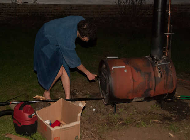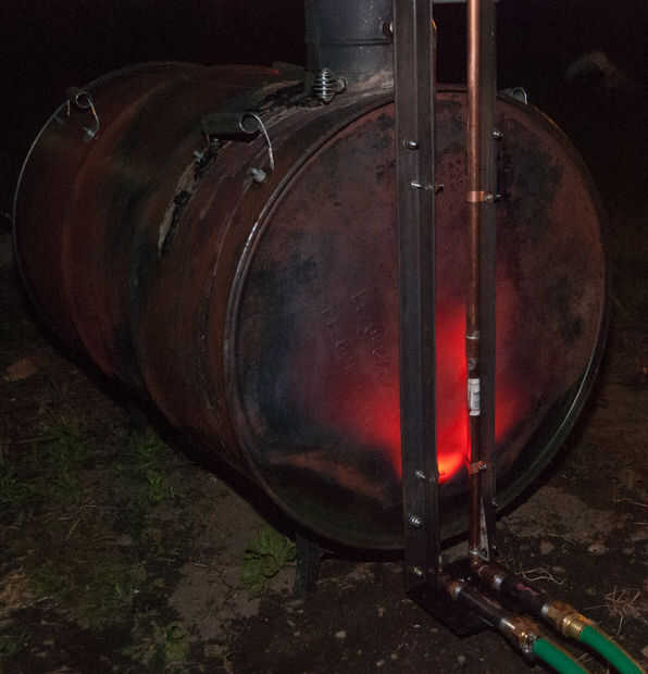 Cuando encendió, decidimos fijar el tubo de escape de una aspiradora de taller para el cañón para conseguir el fuego va un poco más rápido. Trabajó muy bien. De hecho, causa el extremo del cañón a brillar. Con la estufa cerrada, hemos sido capaces de ajustar la temperatura de la bañera girando la aspiradora tienda a aumentar la temperatura en la tina y lo apaga cuando la bañera era lo suficientemente caliente.