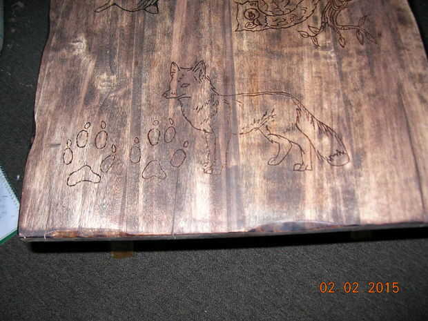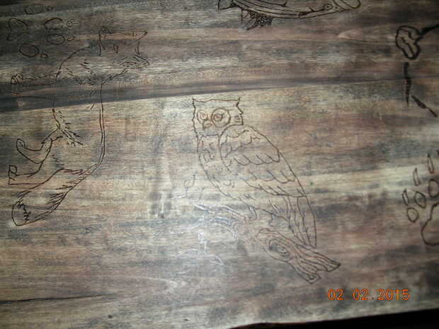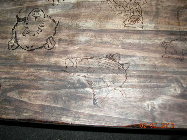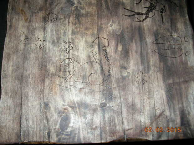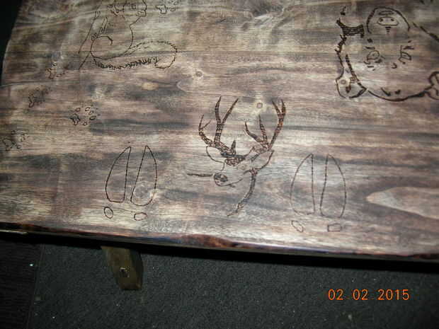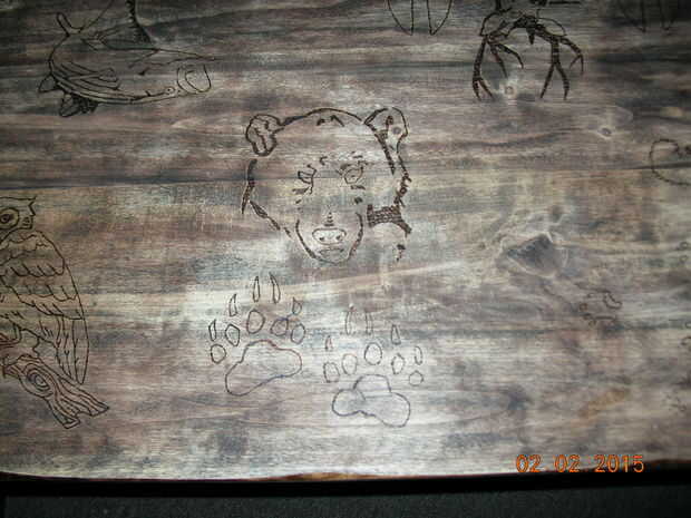 En esta mesa de centro, no tengo el proyector, todo era a mano alzada antes de quemar madera. Comenzó con la cabeza de oso, y propusieron ideas unos días para decidir cómo hacer el resto de la tabla. Después de quemar madera, lijar la mesa y usar la estufa de leña para retocar. Entonces había manchado la mesa con la mancha. Plan de capa clara la mesa pronto.