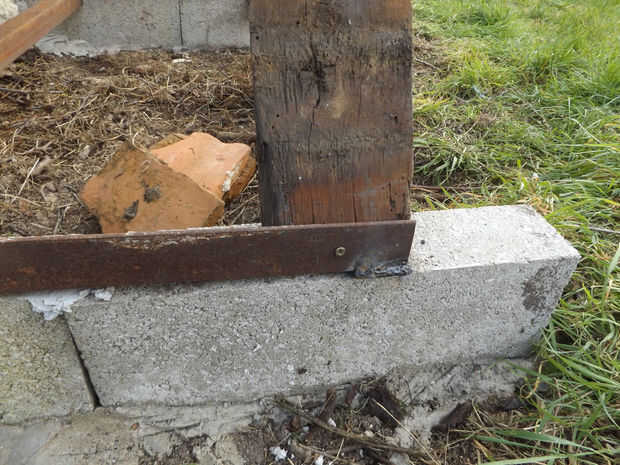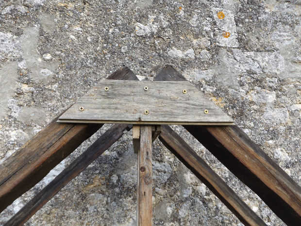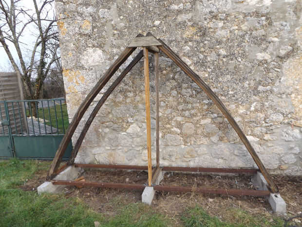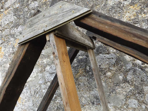 Estructura de la azotea se hace de un soporte central vertical y lateral de 2 tablones para sostener el techo. En mi caso lado planchas vienen de un gran barril que explican por qué está curvados. Tablones rectos funcionan bien también.
