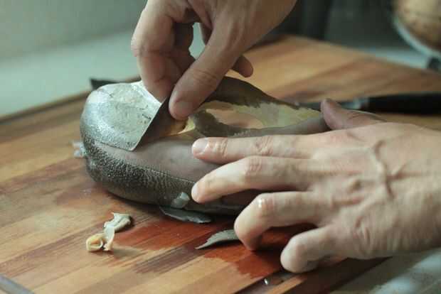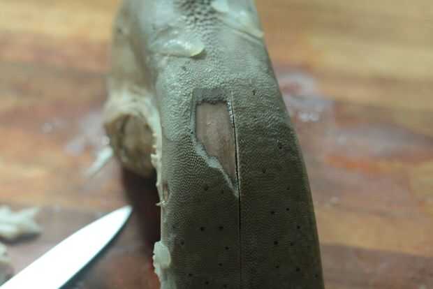 Después de que la lengua se haya enfriado lo suficiente como para manejar, use un cuchillo para quitarles la piel (la capa exterior piense con papilas gustativas).