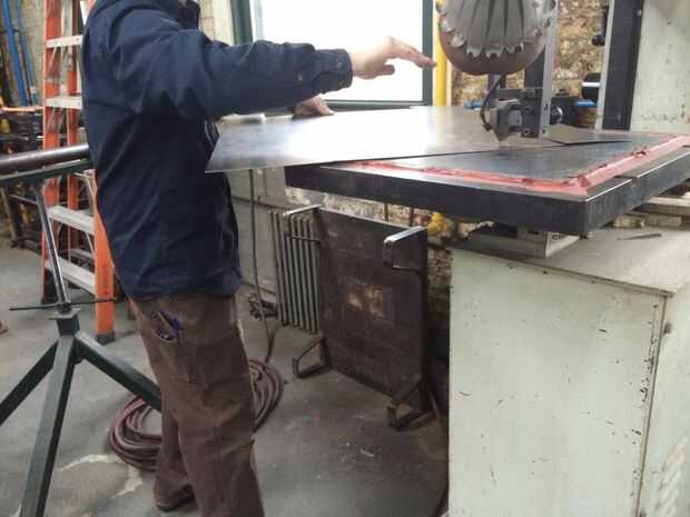 4. llevar la chapa a la sierra. Si la mesa de Sierra de cinta es demasiado pequeña, asegúrese de tener un soporte por debajo de la chapa para hacer un corte estable.
