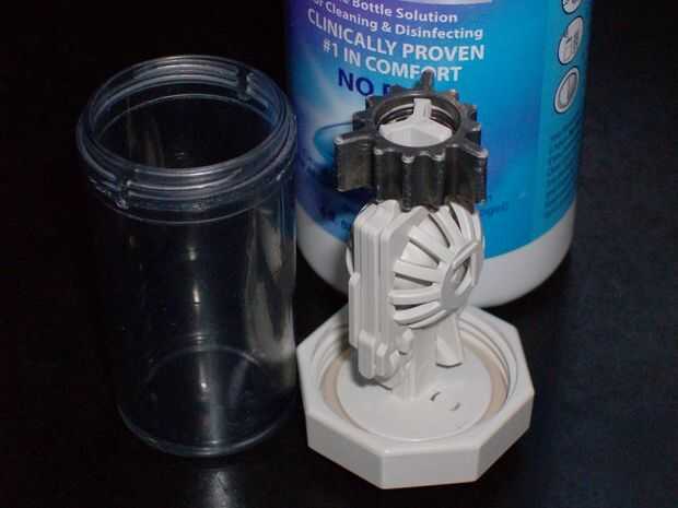 En nuestra casa, siempre tenemos un exceso del objetivo de la desinfección de los envases: los envases últimos 3 meses, la solución funciona más rápidamente y obtener un nuevo contenedor con cada botella. La cosita en la parte inferior del soporte del lente de plástico negro es un platino revestido de plástico, el catalizador de la reacción de desinfección del lente. Dos de ellos serán nuestros electrodos. Nota no son grandes electrodos, la resistencia en la cara de las cosas recubierto de platino es de 1000 a 2000 ohms. Pero son lo suficientemente buenos como para demostrar la reacción.
