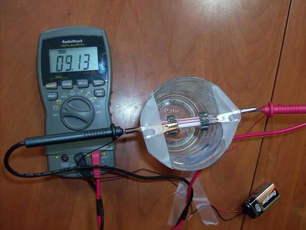 Conectar la batería de nueve voltios y comenzar la reacción de electrólisis. Tenga en cuenta el metro: 9.13V. Si consigues esto, entonces todo funciona.