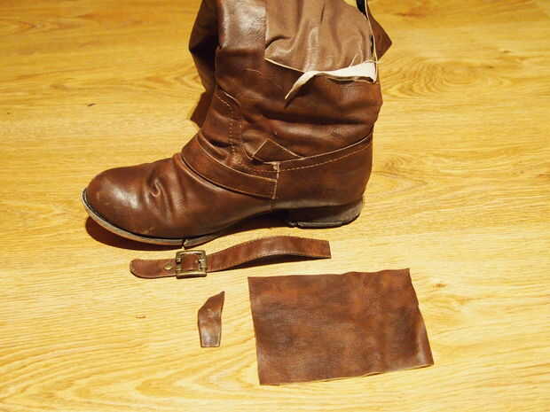 En la imagen se puede ver que también corté la tira pequeña que había sostenido la hebilla a la bota. Esto es una pieza necesaria pero es sólo una pequeña franja con un agujero para sujetar el cuerpo de la hebilla en el depósito.