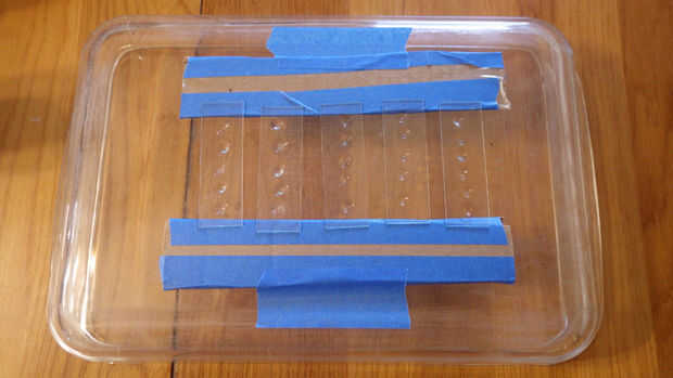 Mientras se hornean sus primeras gotas, preparar una configuración como unas tiras de cartón corrugado con cinta a la parte inferior de un plato horno Pyrex invertida para permitir que los bancos las diapositivas para crear colgantes gotas. Las tiras deben ser lo suficientemente espesa al comedor gotas para colgar. Después de sus primeras gotas se han enfriado, establecer la derecha de diapositivas utilizando las tiras para apoyar sus fines. Colocar una segunda gota sobre cada una de las primeras gotas curadas en una diapositiva. Deje que estas gotas repartidas para casi cubrir la primera gota. Luego invertir la diapositiva de modo que cuelguen las nuevas gotas gotas. Repita con cada diapositiva. Hornear como en el paso 3 y saque para enfriar.