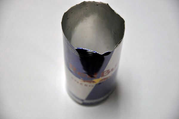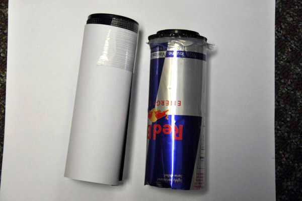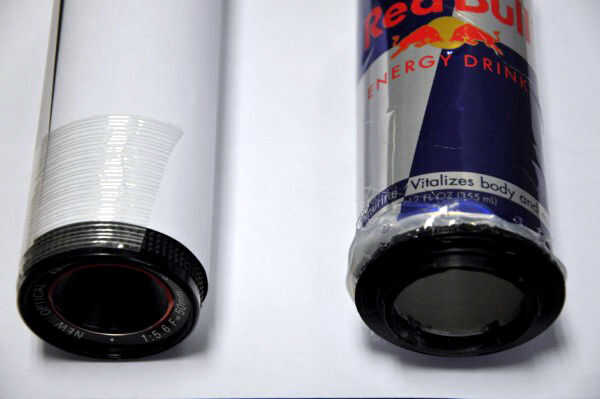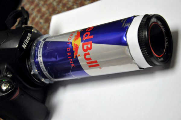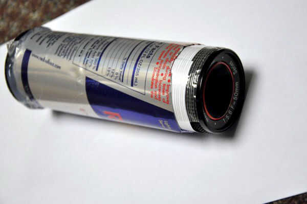 12 fl. oz Red Bull puede, un cuerpo de cámara cubierta para tu cámara SLR y una lente de la cámara lejos de tiro. Este objetivo proviene de un mercado de pulgas y estaba realmente libre, ya que es un pedazo de basura. Es de una cámara de plástico que probablemente no le costó más de $15 - $20 nuevo.