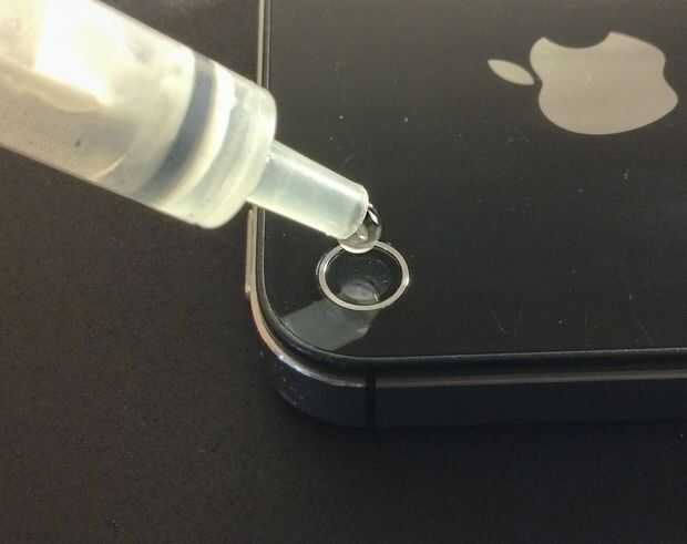 Tomar la jeringa o el hisopo y poner una gota en la lente. Tenga cuidado de no poner demasiada agua en él. La cámara tiene una especie de "anillo" alrededor de él, que puede contener el agua en el lugar. Si hace demasiado grande la gota, el agua corra apagado el telefono, antes de que usted puede entregar.