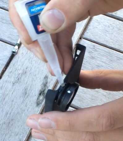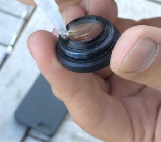 Quitar el móvil de la caja, no desea realmente el móvil para el caso del pegamento permanentemente por error... Luego aplicar pegamento a la lente y alinear el objetivo a sus marcas. Para añadir algo más de fuerza aplica una segunda capa de pegamento alrededor de la lente después de que se había secado la primera capa.