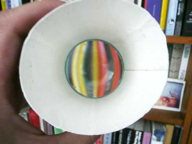Para poner la lente juntos Inserte la lupa en una de las copas que no tiene ningún borde superior para que se sienta en la parte inferior. Inserte la otra taza con ningún borde superior en la Copa con la lupa para que sostiene el cristal en su lugar.
