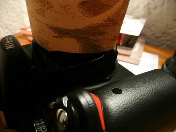 Para colocar la lente de la cámara Inserte la montura en su cuerpo de la cámara dentro de abrir la base de la Copa y seguro con cinta negra. Asegure también el lugar donde los vasos se unen con cinta adhesiva negra para evitar fugas de luz.