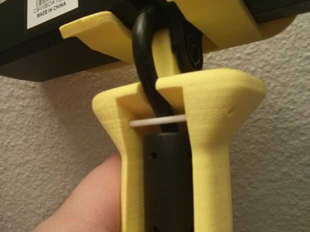 Asegúrese de que el núcleo de ferrita del cable USB quede completamente en la cavidad de agarre. Asegúrelo en su lugar cortando un trozo largo de 36 mm del filamento impresión 3D de 1,75 mm de bobina de material de la impresora 3D. Introduzca el cable en la cavidad e inserte la tira del filamento hacia los lados.
