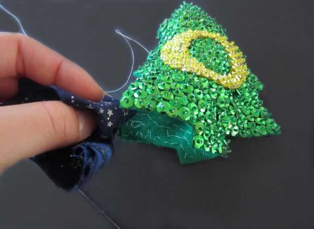 Enhebre la aguja por la parte superior del ornamento luego hilo de perlas. Crear una cadena de unos 4 o 5 pulgadas y el hilo de la aguja hacia atrás a través de la parte superior del ornamento para crear un bucle para colgar el adorno.