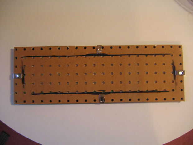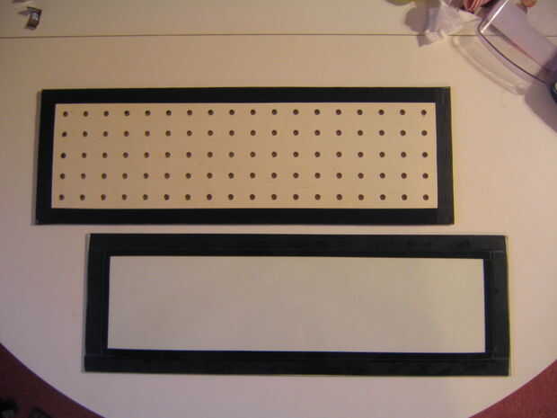 corté un pedazo de vidrio y vieja ventana al tamaño que quería. En el cristal químicamente grabada una frontera dejándolo un poco áspero para que coincida con el tema. Para más lejos, he creado un borde con cinta aislante. Es un look bastante fresco. Me corte un pedazo de madera para emparejarlo y sólo utiliza la cinta eléctrica para ocultar los bordes de madera. Compré un marco de imagen de la tienda del dólar con los ganchos de metal poco de él (foto abajo) y saqueó los ganchos del marco. Tuve que cortar cuatro ranuras en la parte posterior de la madera para los ganchos de agarre. No tengo muchas herramientas que cortan finas ranuras en madera usé mi amoladora angular con una cremallera fina corte. Asegúrese de hacer esta exterior si vas a probar. Estos discos de amoladora no estaban destinados a cortar la madera y se pone muy ahumado rápido.
