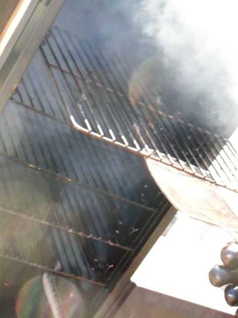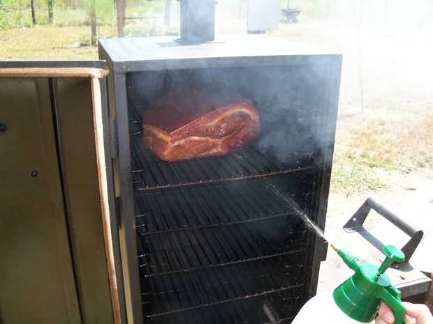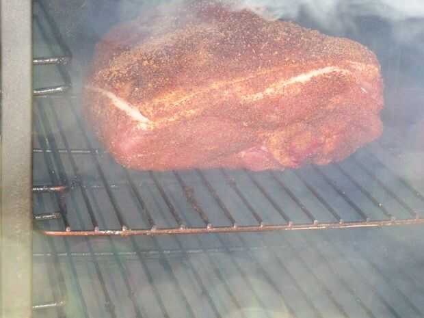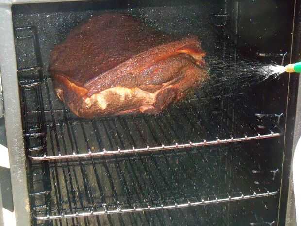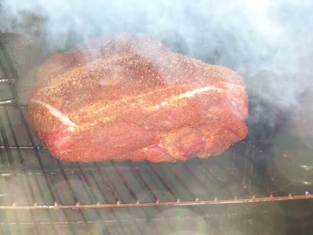 Se utilizó madera de nogal y nuez de este hombro. Iniciar algunos carbón (no importa de qué tipo) y que como el calor. Deje que el hombro tiene algo de humo por 4 horas (a veces voy a hacer hasta 5 horas) a 220 grados. Especialmente me gusta cocinar carne de cerdo, hueso de cerdo, a una temperatura más baja durante más tiempo. Rocíe la carne cada 30 minutos con una mezcla de manzana sidra y jugo de naranja. Yo siempre cocinar fat cap (el lado con la grasa) pero lo puedes hacer de cualquier manera.