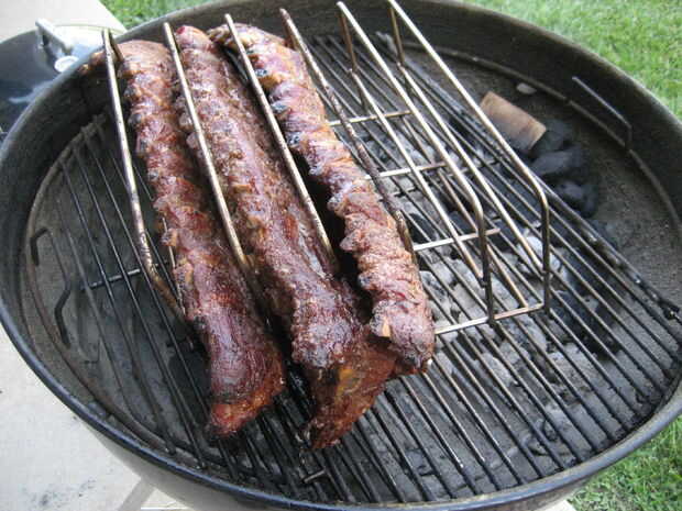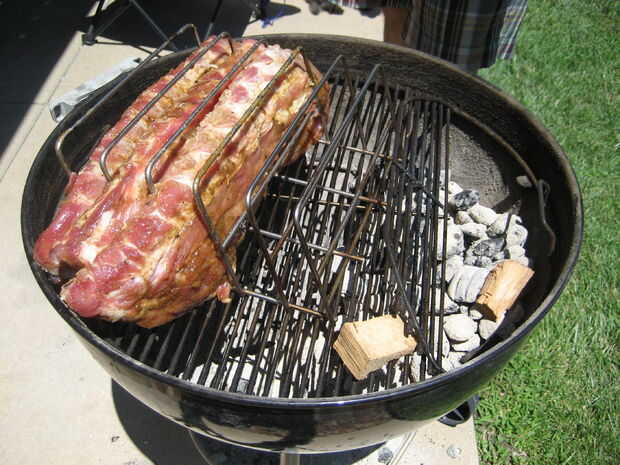 Coloque unos trozos de nuez, cereza u otra madera de fruta y nueces en las brasas y deje arder mientras que las costillas. Busque luz whisps de humo una vez la tapa. No queremos uñas con humo áspero - estamos buscando aroma y sabor. Tarda tiempo y tenemos un montón de tiempo a nuestro lado.