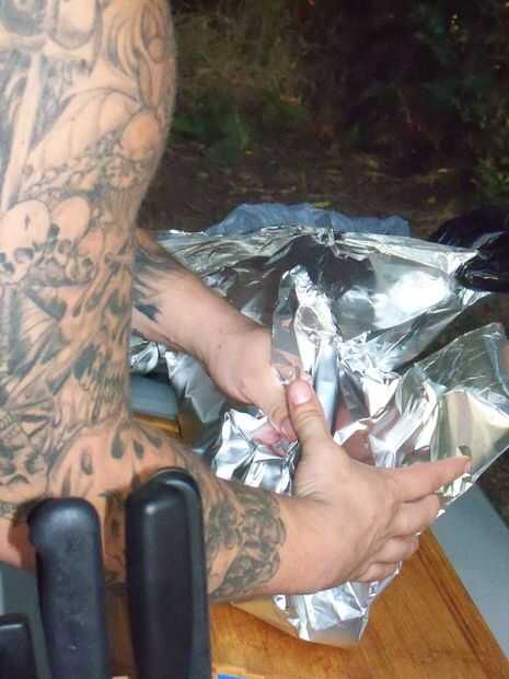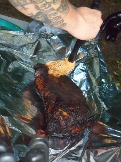 Después de cuatro horas, sacar pecho y prepárate envolver. Asegúrese de que utilice papel de servicio extra pesado o una cacerola de aluminio con papel de aluminio sobre la parte superior. Esto evitará que los jugos de la carne. Cuando se quita la falda para envolver, fregona o vierta en algo de salsa y luego enróllelo firmemente para mantener todo ese líquido en.