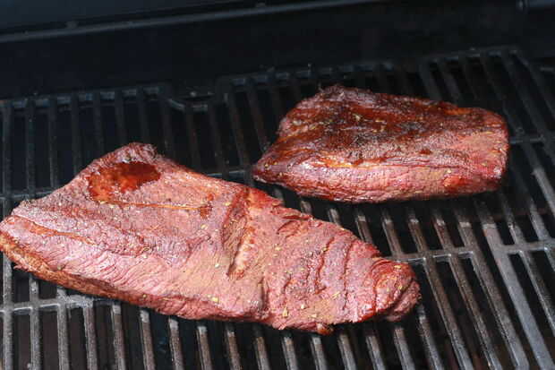 8:45 - lugar pecho grasa lado hacia arriba en la parrilla precalentada o fumador. Coloque un trozo de madera en carbón. Agregar brasas necesarias para mantener la temperatura.